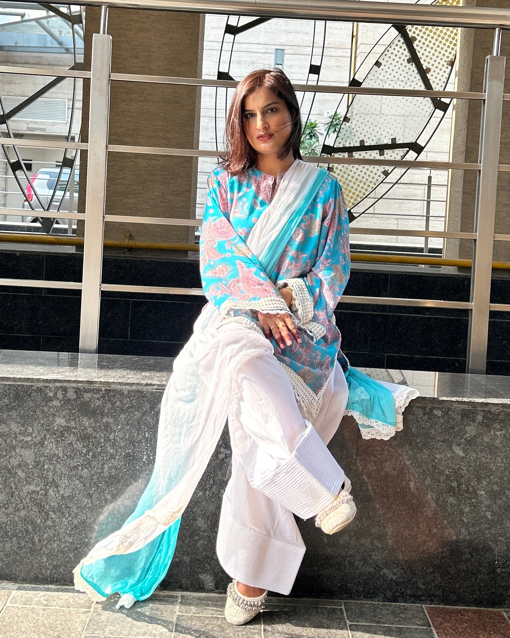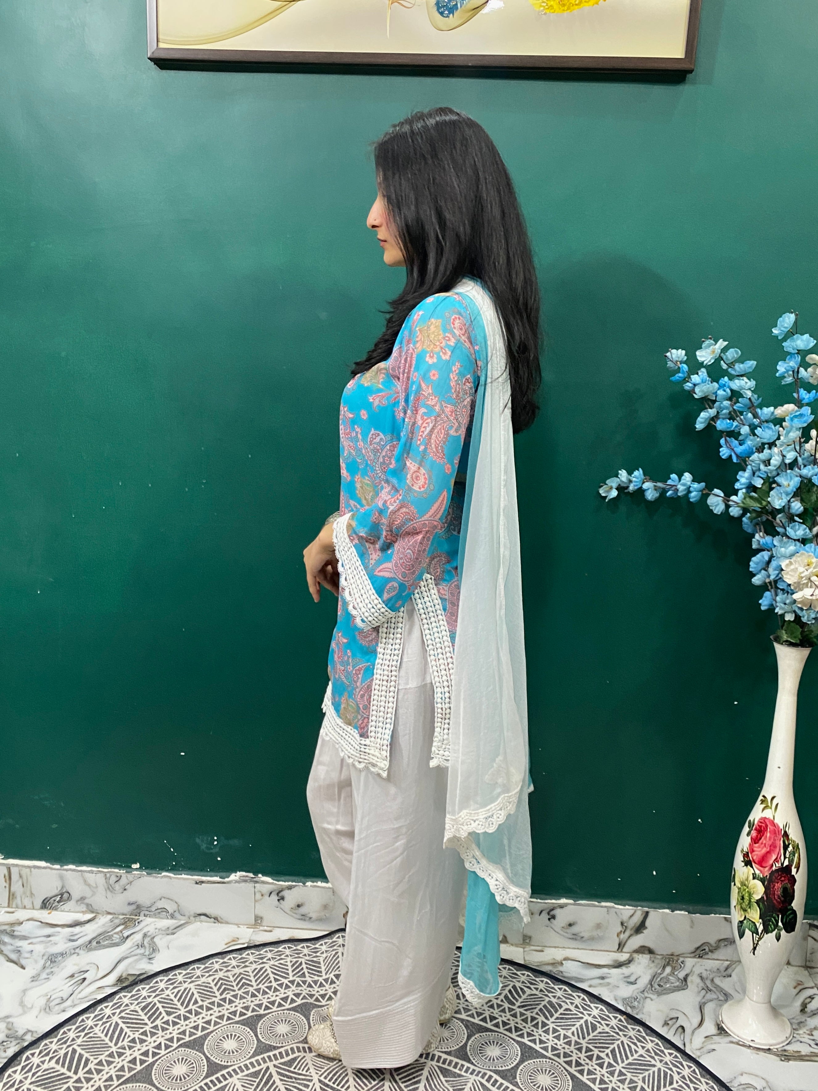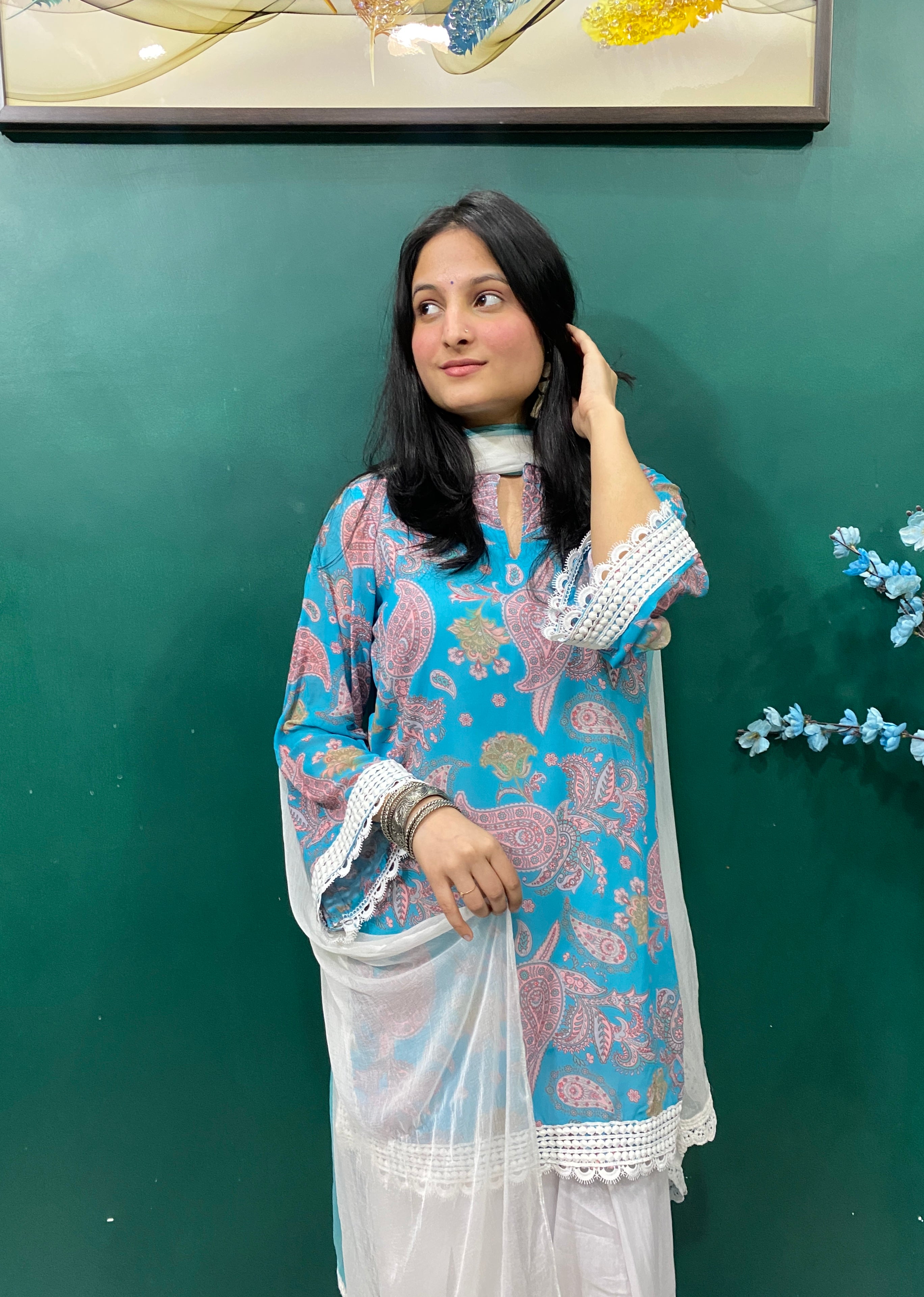 This three-piece ensemble features a sky blue paisley patterned Kurti in soft georgette, finished with intricate lace detailing along the sleeves and hemline. The delicate floral print evokes a sense of warmth and nostalgia, while the oversized silhouette flows effortlessly — offering comfort without compromise.