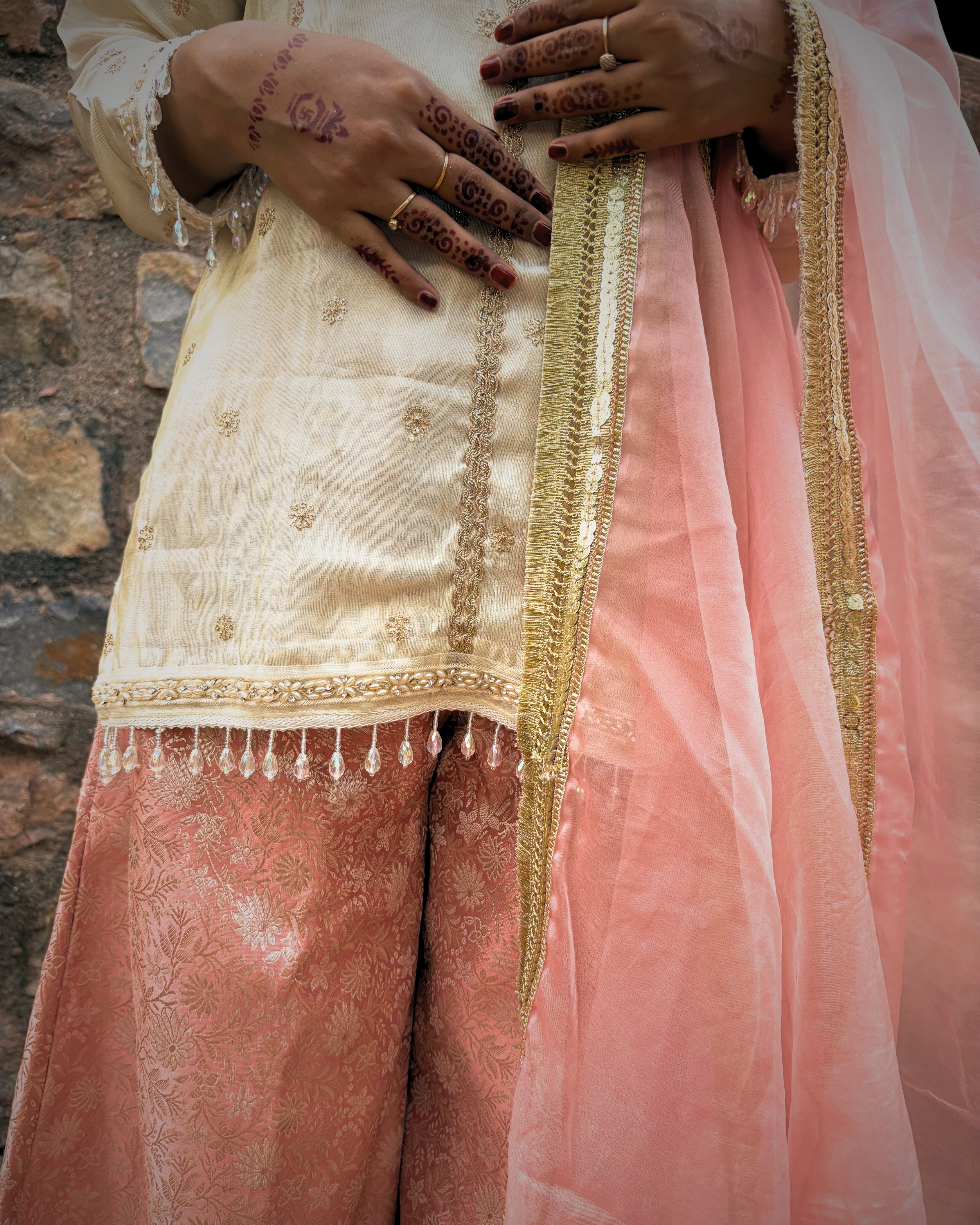From our Afsaana collection- a tale of timeless elegance and handcrafted stories—this three-piece set blends subtle charm with traditional finesse. The short kurti in cosmos fabric pairs beautifully with a soft peach organza dupatta adorned with gotapatti lace borders and a Banarasi brocade bottom that adds a regal touch.