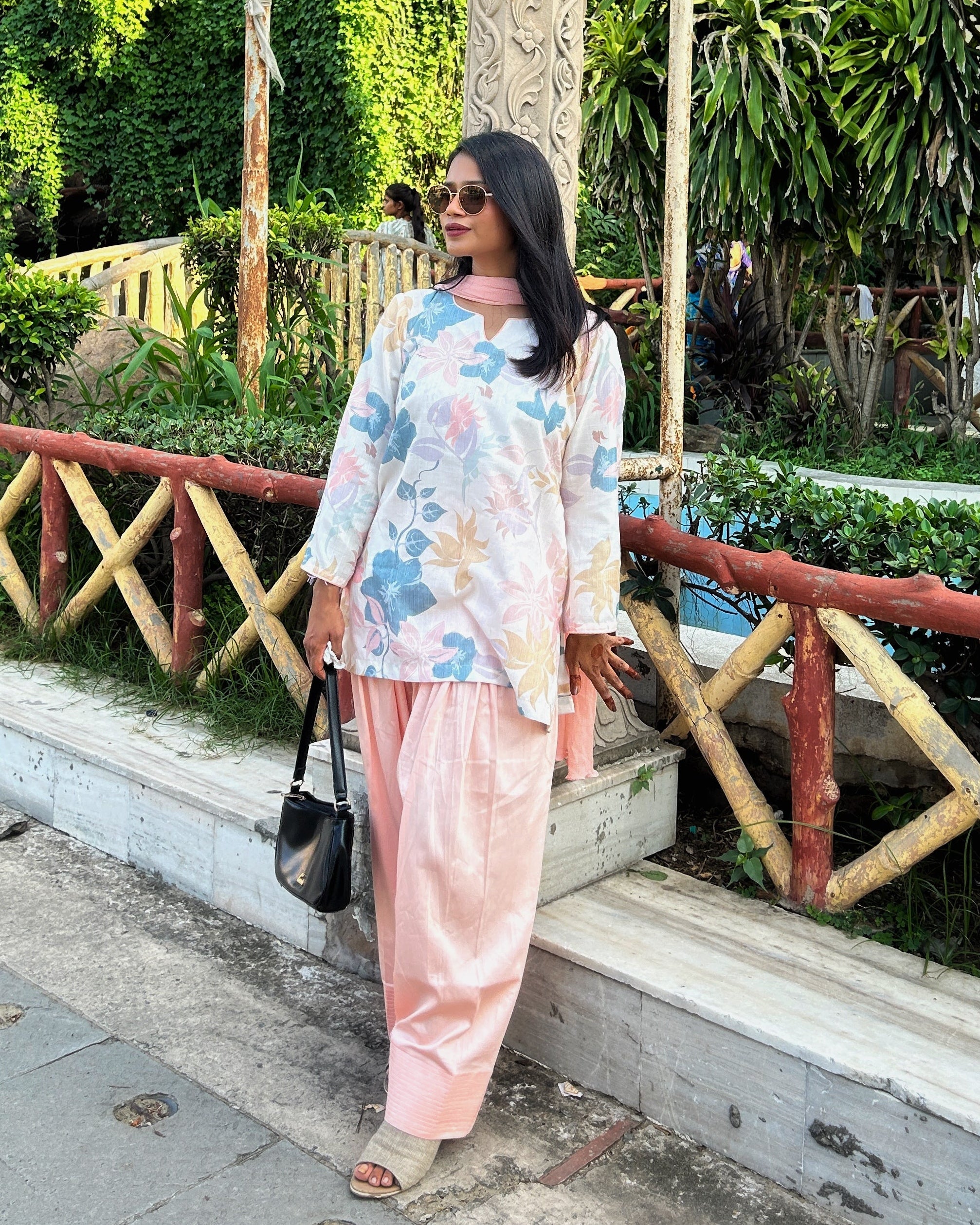 Peach Floral Print Farshi Salwar Suit from our Jamun Collection in soft peach, this thoughtfully crafted set blends comfort, elegance, and everyday ease. The short, loose-fitted cotton-linen kurta features delicate floral patterns and playful bell sleeves, finished with a handy side pocket—because function matters.
