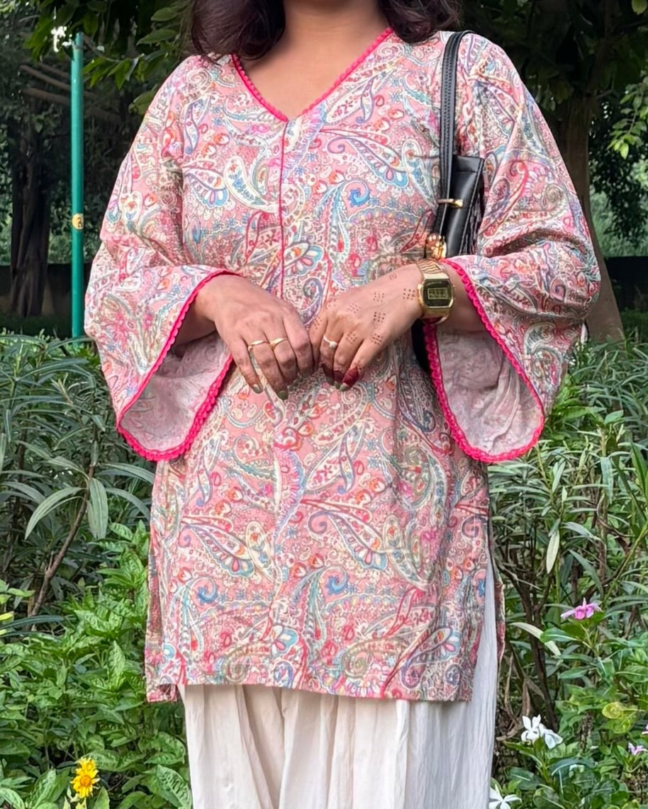 This peach-blue paisley print short kurti from the Lavya Collection by Punchakshri beautifully combines comfort with understated elegance. Made from 100% pure cambric cotton, it features soothing multi-color hues adorned with delicate paisley prints, bringing timeless charm to your everyday style.