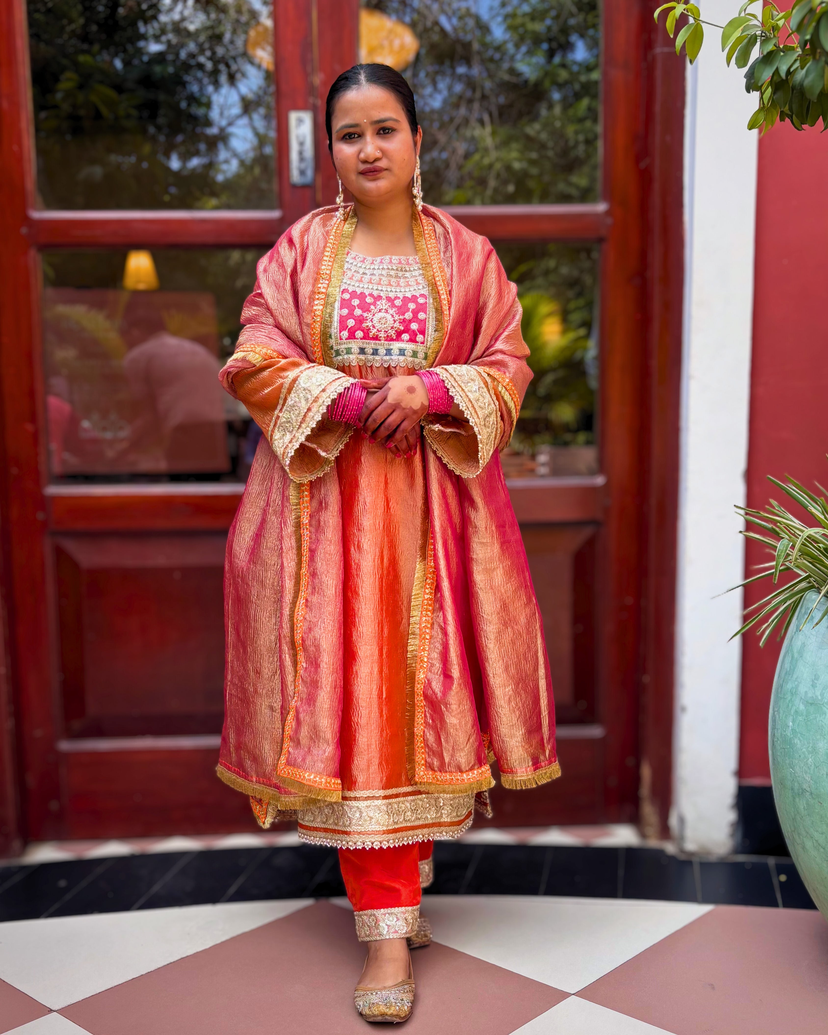 Paired with sleek, pant-style bottoms in a contrasting orange hue, finished with intricate lace on the hem, this ensemble strikes the perfect balance between elegance and ease. The look is completed with a rani pink dupatta adorned in exquisite gota work, lending a vibrant contrast that captures the festive spirit effortlessly. The rich Banarasi fabric offers a beautiful dhoop-chaav (sunlight and shade) effect, giving the outfit a luminous, regal sheen from every angle.